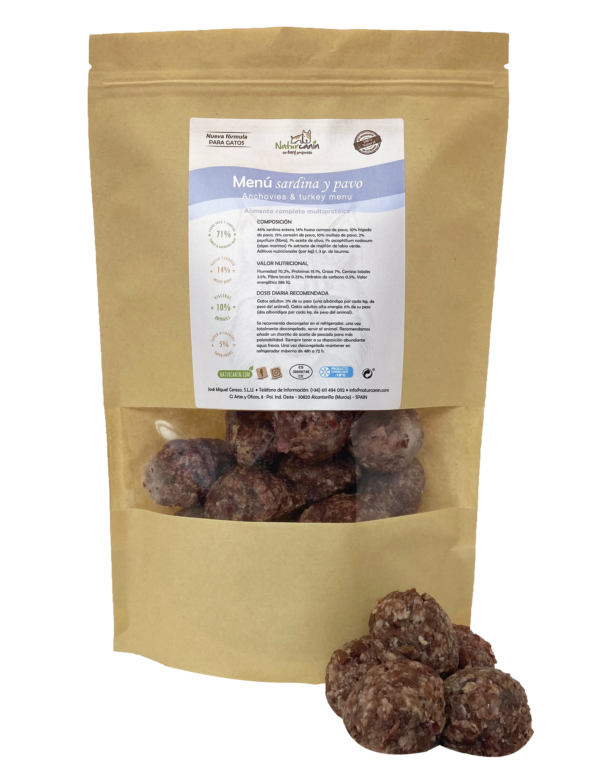 Menu multiproteico completo con alto contenuto di carne di tacchino e sardina, una preziosa fonte di omega 3.